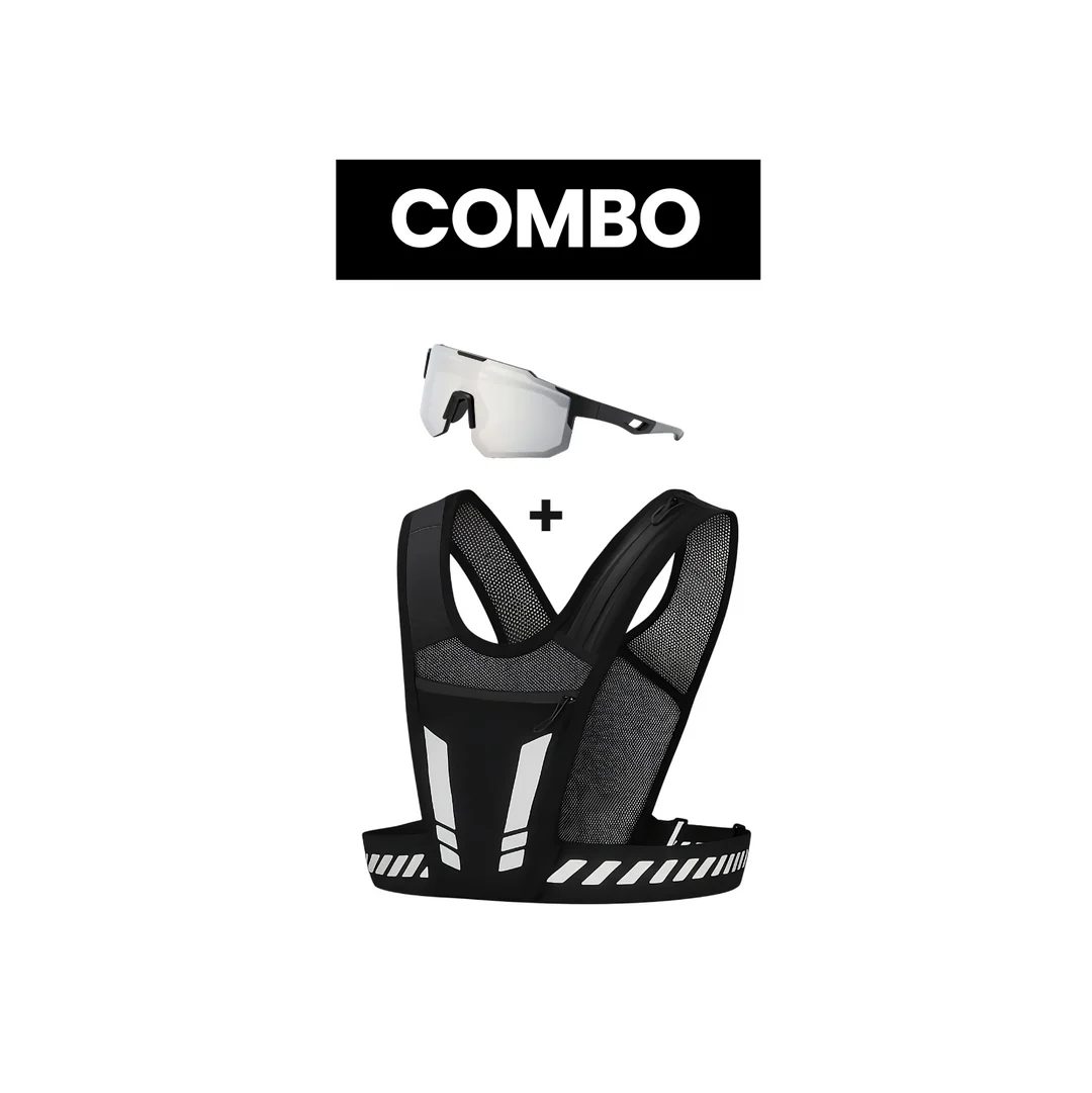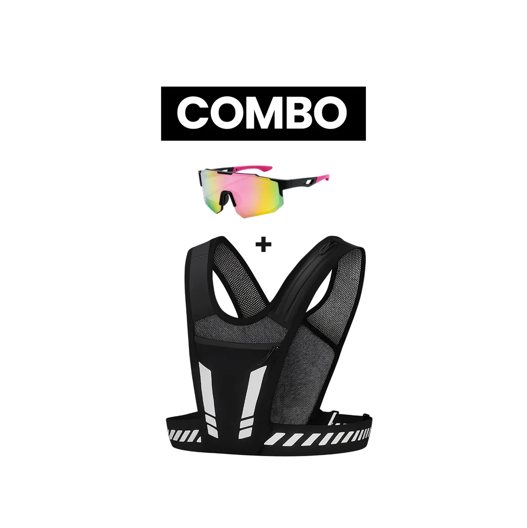 Colete de corrida ultraleve com óculos esportivo UV de brinde. Ajuste ergonômico, bolsos para soft flask e material respirável. Desenvolvido para atletas que buscam leveza, conforto e máxima performance em cada treino ou prova.