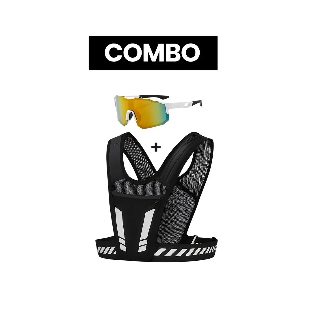 Colete de corrida ultraleve com óculos esportivo UV de brinde. Ajuste ergonômico, bolsos para soft flask e material respirável. Desenvolvido para atletas que buscam leveza, conforto e máxima performance em cada treino ou prova.